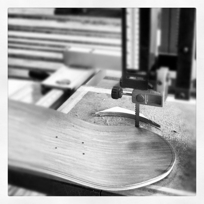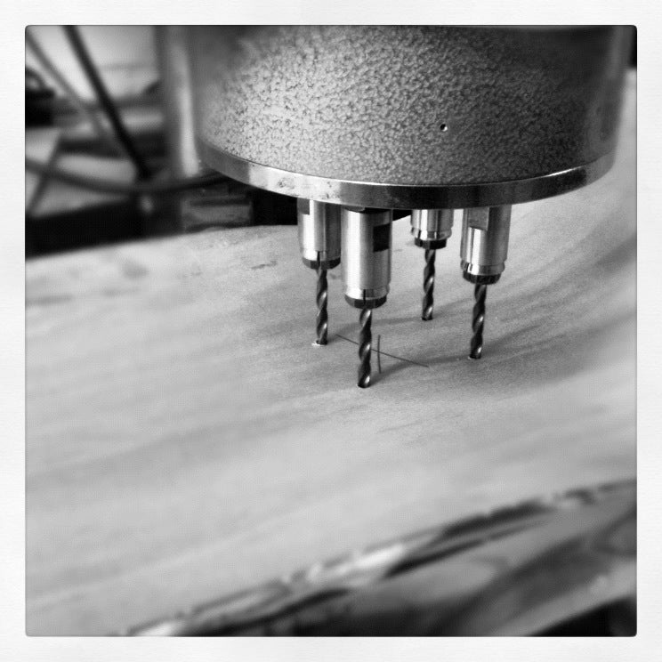 After glueing and pressing the plies, the boards needs holes for the trucks. With a special drilling machine we make the holes, the holes must be very exatly be drilled, otherwise you have fuckup holes in your deck. We have different wheelbases. The wheelbases depends on the width of the